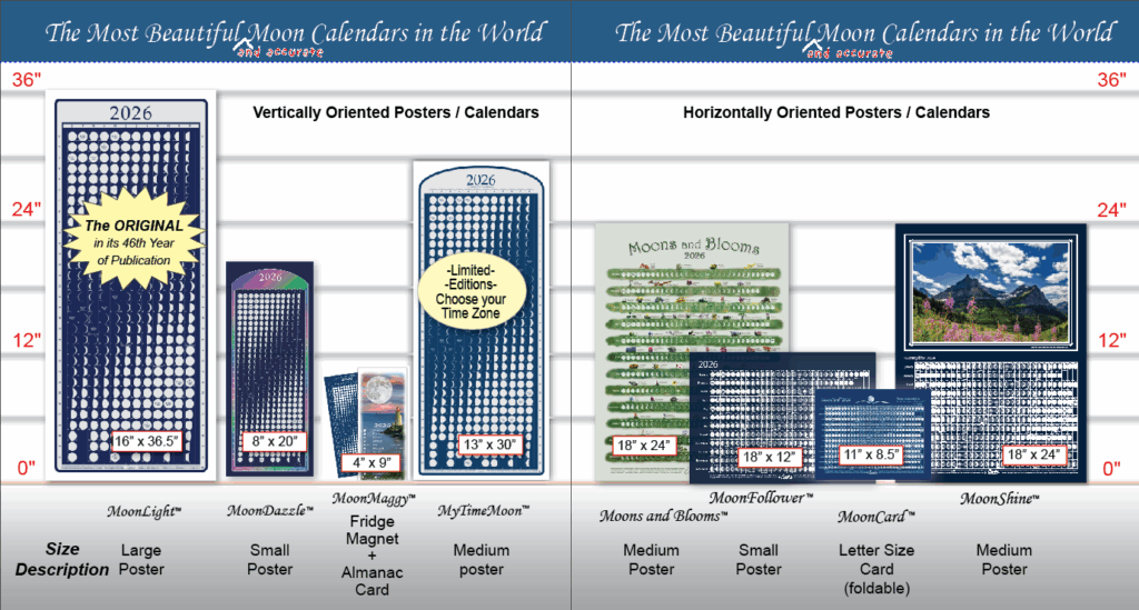 Beautiful moon calendars in sizes and formats from greeting cards and fridge magnets to small, medium and large size posters. All are scientifically accurate and aim to please the artistically minded as well as astronomer types.